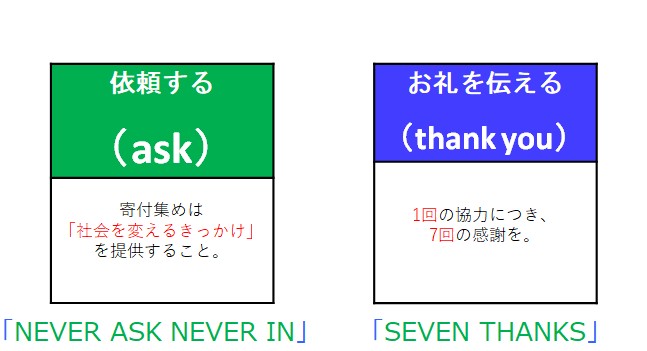 「Ask」についていえば、寄付のお願いをしていくことは、単なる資金的な援助を求めていくだけでなく、そこに社会的な課題があることに共感してもらい、その解決策を理解して、納得してもらうための働きかけである。そして、それによって相手を寄付を通じて、社会課題解決に参画するきっかけを与えていくことになる。[No Ask, No money]とか[Never Ask, Never in]といわれるところのゆえんでもある。