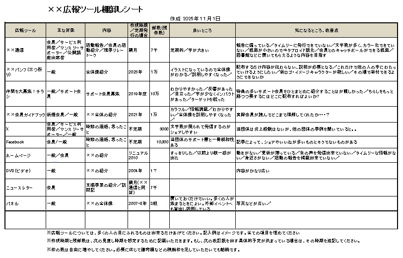 そのためには、まずどんな広報に関するツールがあるかを一覧にして書き出してみる。その際に、具体的な在庫数、対象としている層、更新時期などに加えて他の資材と比べて、改善のアイデアなど思いついたら、書き込んでいく。実はこれだけで、かなり客観的に全体像と改善点が把握できるようになってくる。もしも可能であれば、ベンチマークとする他の団体と比較してみることも効果的だ。